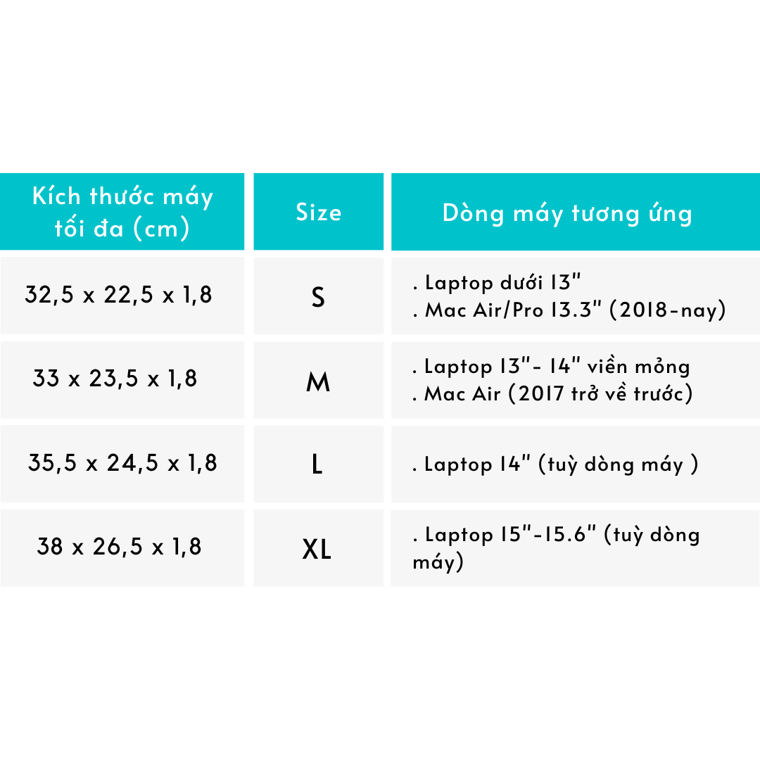- Size S: 32.5 x 22.5 x 1.8cm (phù hợp cho laptop dưới 13 inches/MacBook Pro 13 inches/MacBook Air năm 2018 đến hiện nay/M1,M2).